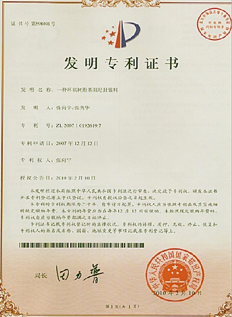 此專利于2007年向國家產(chǎn)權(quán)局提交發(fā)明專利申請,經(jīng)過長達(dá)兩年多的審核 認(rèn)證,于2010年2月通過審核環(huán)氧樹脂基阻尼封裝料專利證書,成功獲得該專利號:ZL2007 1 0192619.7