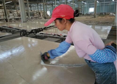 3.施膠:將混合好的膠水倒在石材面板上,用刮刀來回刮涂,如有重大缺陷,應先將土層去除,再用膠和石粉調(diào)勻修補缺陷,待膠固化后打磨,再刮涂面板。冬季氣溫較低時可以對膠水和板材進行適當?shù)募訜,然后再進行施膠。